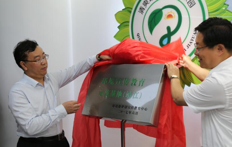 环保部宣教中心副主任闫世东与靖江市委副书记、市长叶冬华共同为环境宣传教育示范基地(靖江)揭牌