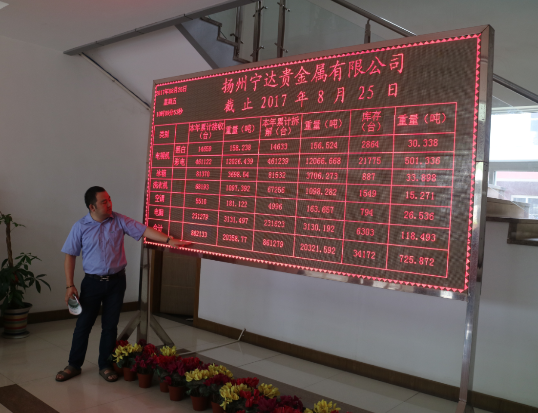 扬州宁达贵金属有限公司的公示牌显示,截止到8月25日,公司2017年累计接收、拆解废弃家电86万多台,总重2万多吨。据介绍,目前废弃家电拆解主要对象为“四机一脑”,即电视机、冰箱、洗衣机、空调和电脑。