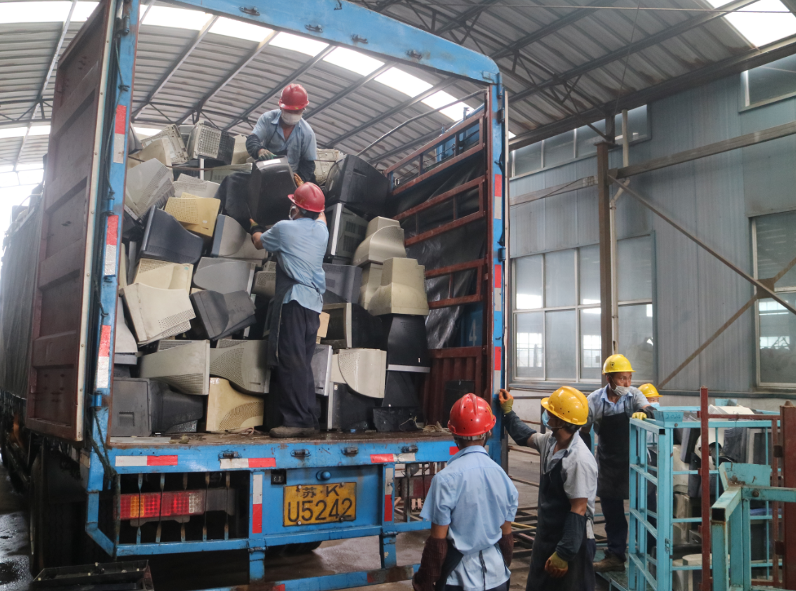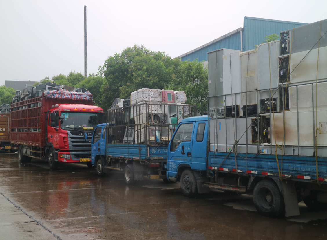 上午10点,在扬州宁达贵金属有限公司,几辆大卡车进进出出,车上满载着废弃家电,工人们正在忙着“卸货”。