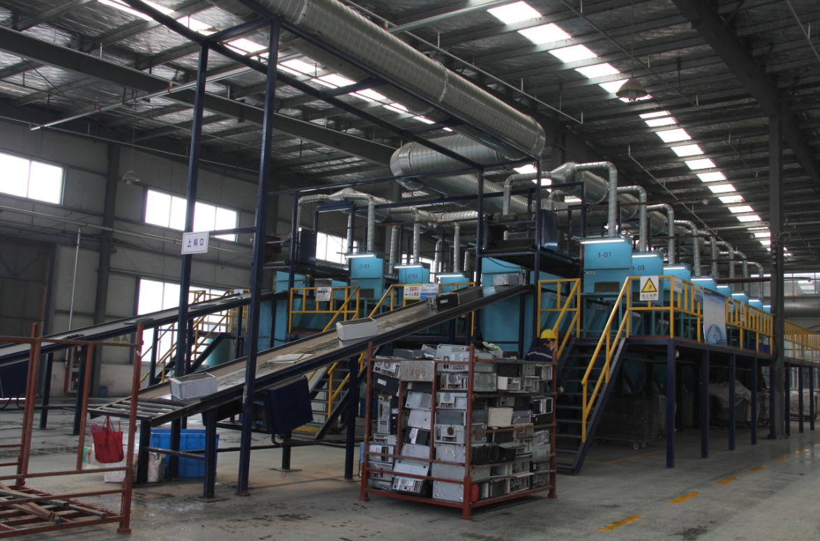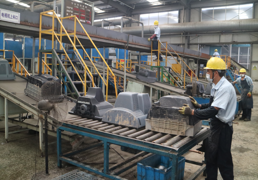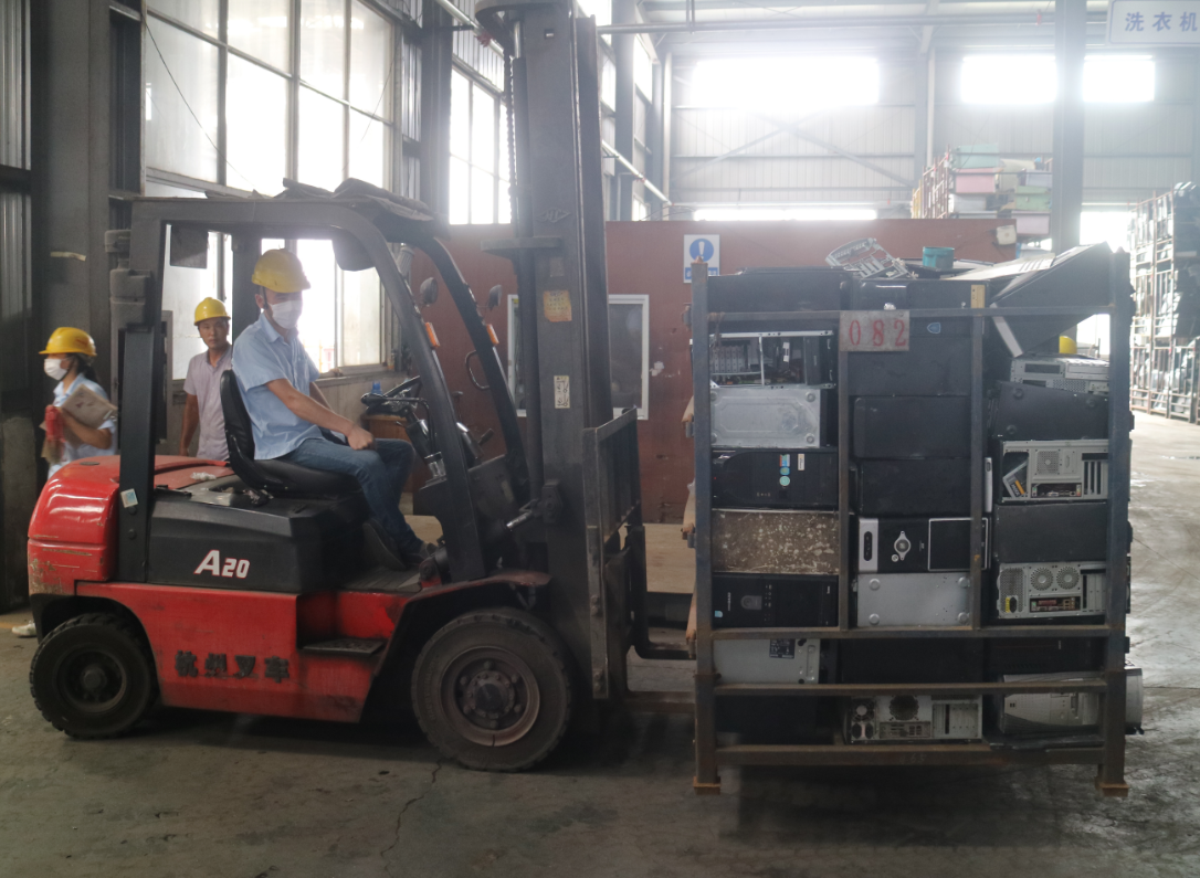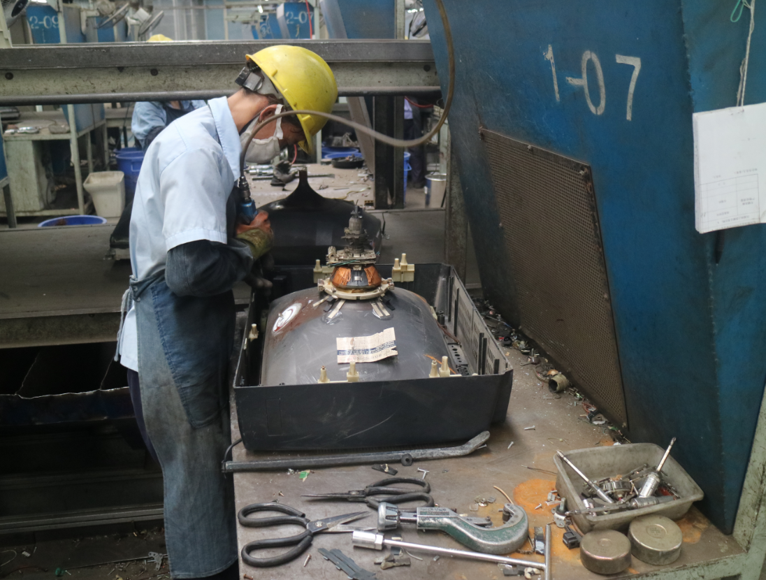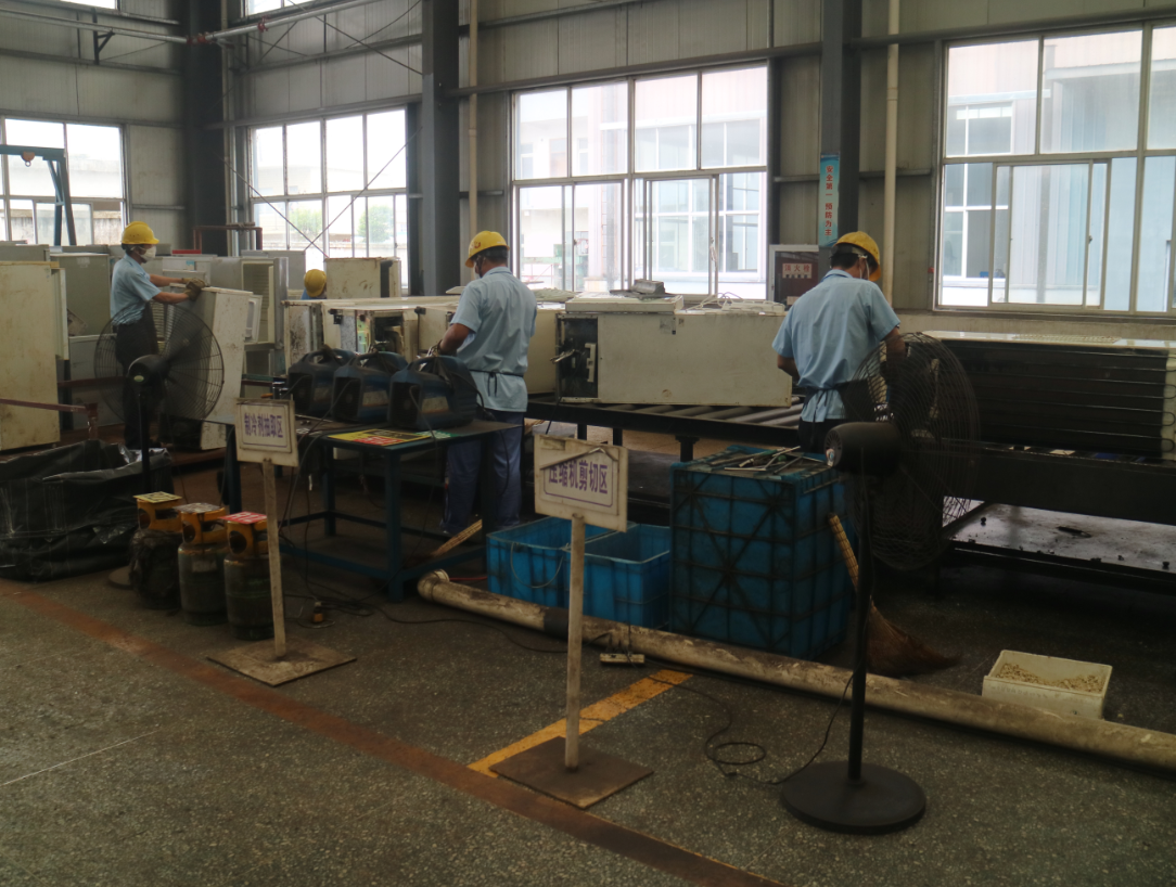 在整座厂房里,一件件“灰头土脸”的电冰箱、电视机、洗衣机被送上蓝色的流水线,再出来时,就已变成分好类的铁料、铜料、塑料等材料。